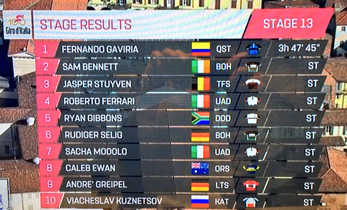 La etapa fue ganada por el colombiano Fernando Gaviria, quien en un espectacular cierre se dejó la victoria. En total, ha ganado cuatro etapas en este Giro.