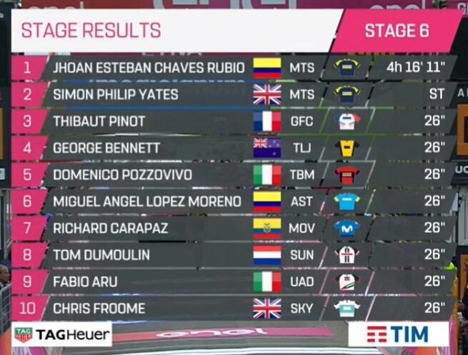 Con Chaves a buen recaudo, Yates soltó un latigazo que le permitió enlazar con el ciclista bogotano en el último kilómetro. La cima ya era cuestión de dos hombres del Mitchelton. El británico estaba más fuerte, para ganar, pero después de todo el día escapado la gentileza se impuso al interés personal. Etapa para Chaves, Maglia rosa para Yates. Todo quedó en casa.