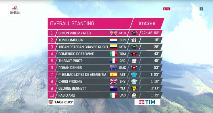 La exhibición de la sexta etapa disputada entre Caltanissetta y el Etna, con un recorrido de 159 kilómetros, se concretó con el doblete de los dos hombres fuertes del Mitchelton. Ambos cruzaron juntos, con ligero adelanto del colombiano Chaves y un tiempo de 4h.16.11, a una media de 39,7 kms/hora.