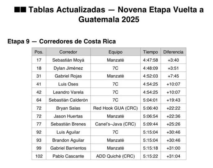 Este sábado se disputó la novena y penúltima etapa de la Vuelta a Guatemala 2025 que cuenta con la presencia de dos equipos de Costa Rica: 7C Economy Hyundai y Manzaté La Selva Scott.