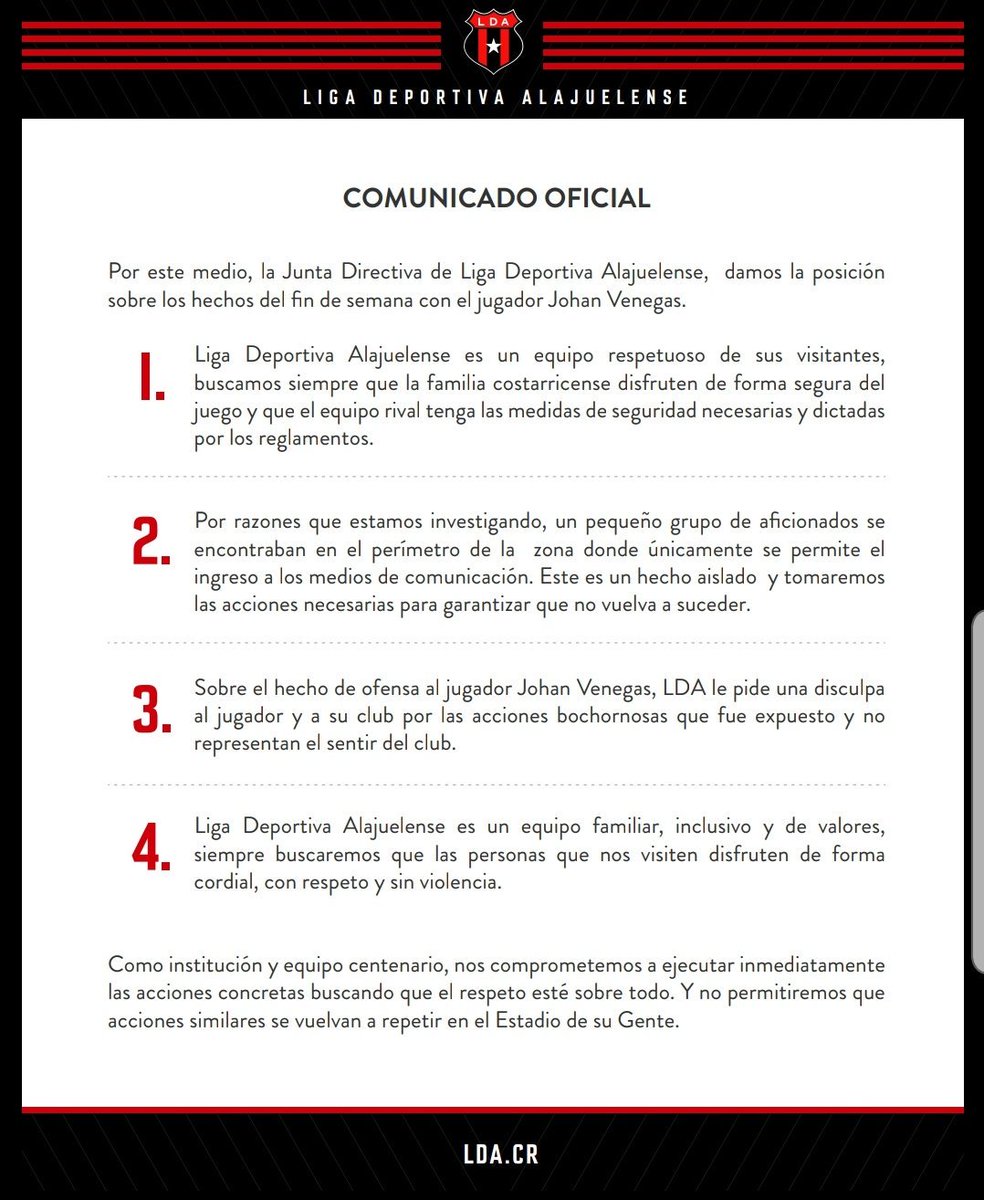 Liga Deportiva Alajuelense prometió tomar "las acciones necesarias" para garantizar que insultos como los recibidos por Johan Venegas tras el clásico, no se vuelvan a presentar.