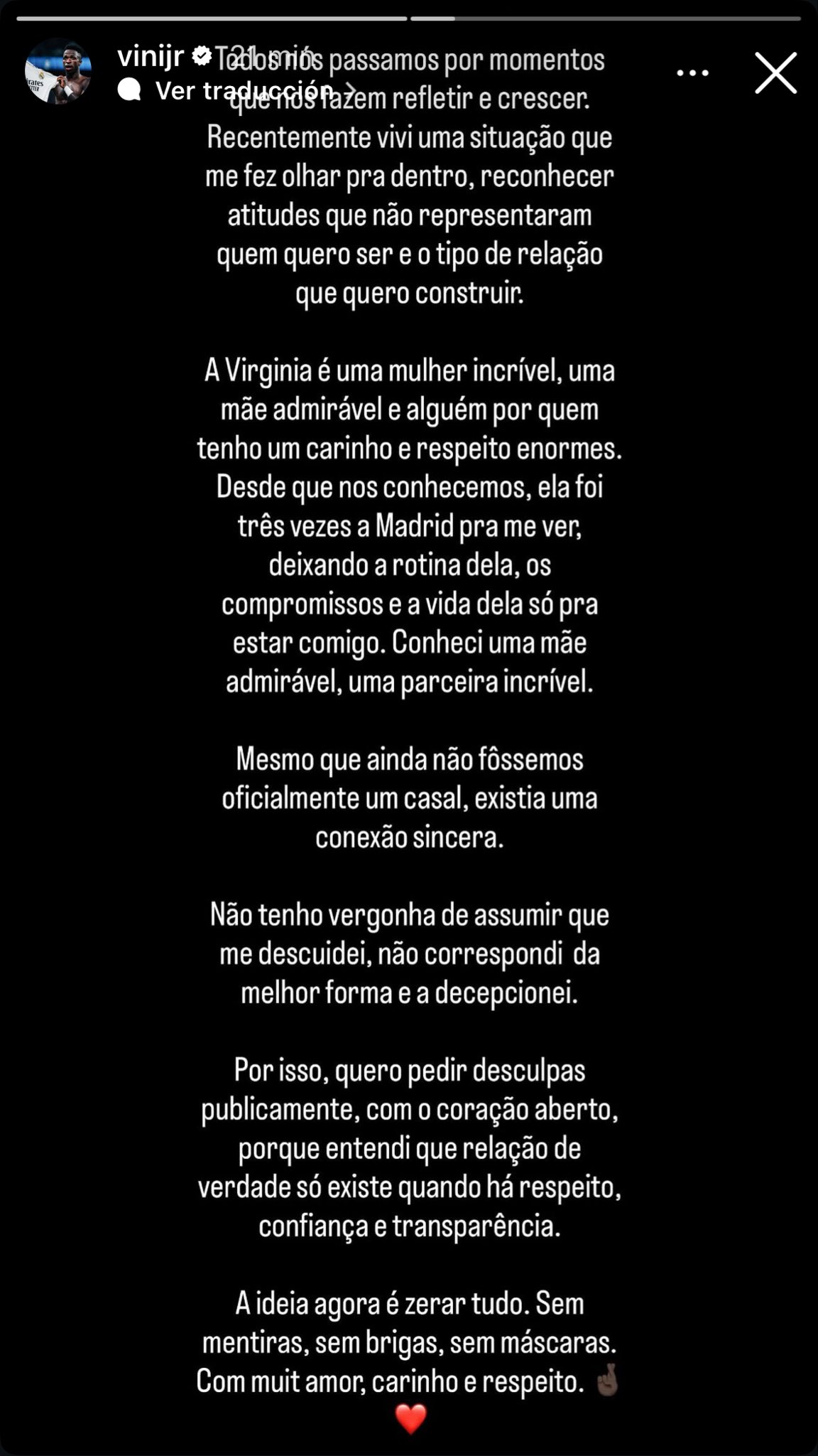 ‘Vini’ actualmente se encuentra concentrado con la Selección de Brasil, pero por medio de su cuenta de Instagram emitió un comunicado para disculparse con Virginia.