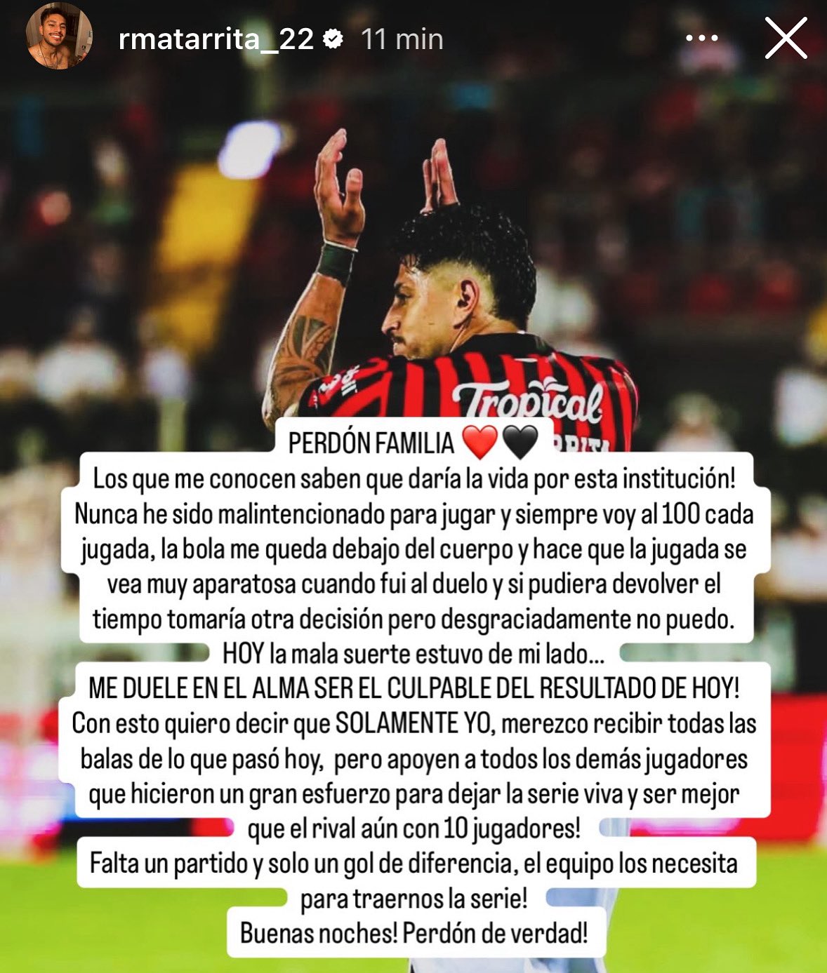 Matarrita también señaló que “ME DUELE EN EL ALMA SER EL CULPABLE DEL RESULTADO DE HOY! Con esto quiero decir que SOLAMENTE YO merezco recibir todas las balas de lo que pasó hoy, pero apoyen a todos los demás jugadores que hicieron gran esfuerzo para dejar la serie viva y ser mejor que hicieron un gran esfuerzo para dejar la serie viva y ser mejor que el rival aún con 10 jugadores”.