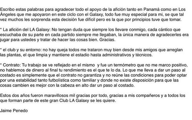 El guardameta panameño Jaime Penedo explicó mediante una carta las razones que lo llevaron a dejar las filas del Galaxy. Según el jugador, el contrato con el cuadro norteamericano no le garantizaba una estabilidad para él y su familia.