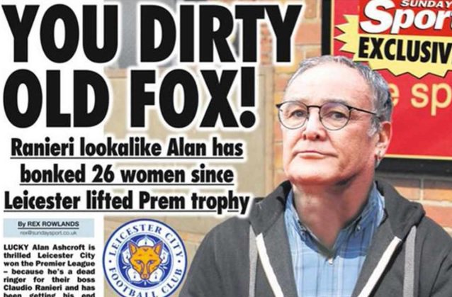 Alan Ashcroft es un electricista escocés en paro que guarda un parecido más que razonable con el técnico italiano Claudio Ranieri. No, no es su hermano gemelo aunque lo parezca. Son idénticos pero no tienen nada que ver el uno con el otro. Lo curioso es que según el tabloide Sunday Sport, Ashcroft está teniendo mucho éxito entre las mujeres de Leicester.