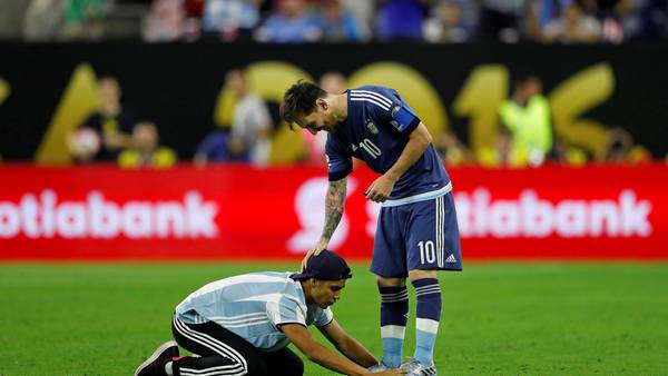 Cuando ambos equipos estaban formados en la cancha para que empiece el partido, un hincha vestido con la camiseta argentina saltó desde la tribuna e ingresó corriendo a la cancha en busca de la 'Pulga'.