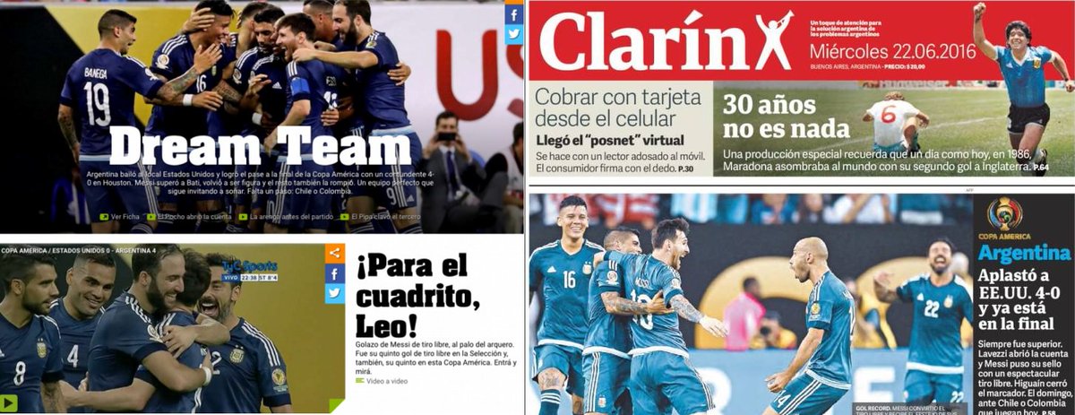El sitio TN por su parte resaltó: "Es ahora o nunca. La selección de Argentina cumplió con creces las expectativas para esta Copa América Centenario y el domingo irá por toda la gloria".
