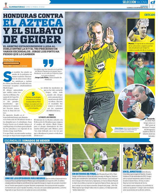 Geiger fue un árbitro “funesto en el partido de México-Panamá y se lo ponen hoy a Honduras, no sé cuál es el interés o qué es lo que buscan. Nosotros vamos a pedir que se cambie el árbitro”, explicó Pinto a medios hondureños antes de viajar a Cuernavaca.