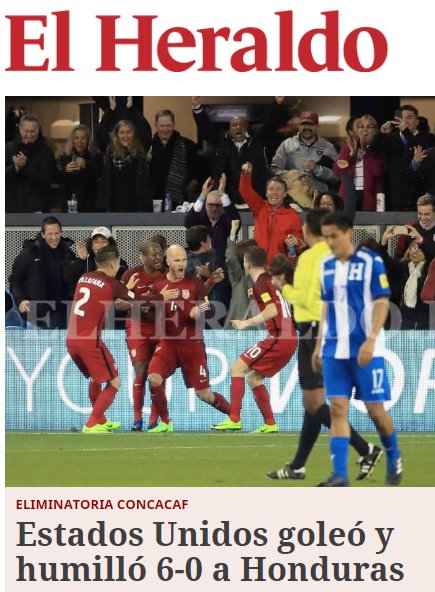 Diario El Heraldo resaltó el triunfo de los norteamericanos en los mismos términos: "Estados Unidos goleó y humilló 6-0 a Honduras" y "La H pasa al último lugar de la eliminatoria"