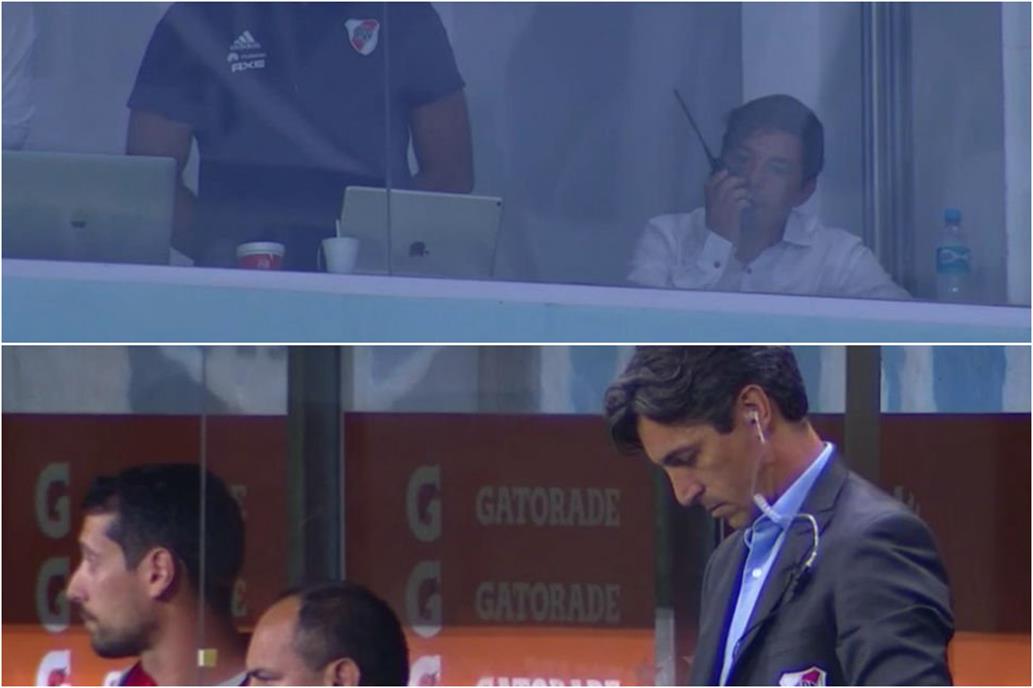 Pero la polémica no sólo se instaló por lo pasó en la cancha, sino por lo que estaba sucediendo fuera de ella, más precisamente en una de las casetas del Arena do Gremio. Ahí se encontraba Marcelo Gallardo, quien estaba suspendido por el atraso de su equipo en el ingreso a la cancha para la semifinal de ida disputada en el Monumental y no podía dirigir en la vuelta. Sin embargo, considerando la importancia del encuentro, no cumplió con la sanción y constantemente envió instrucciones a su cuerpo técnico, además de asistir al camerino en el entretiempo.