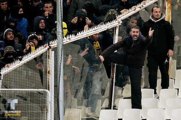 Antes del inicio del partido entre el AEK Atenas y el Ajax de Holanda, las dos parcialidades se enfrentaron en las gradas del estadio con bengalas y bombas de estruendo.
