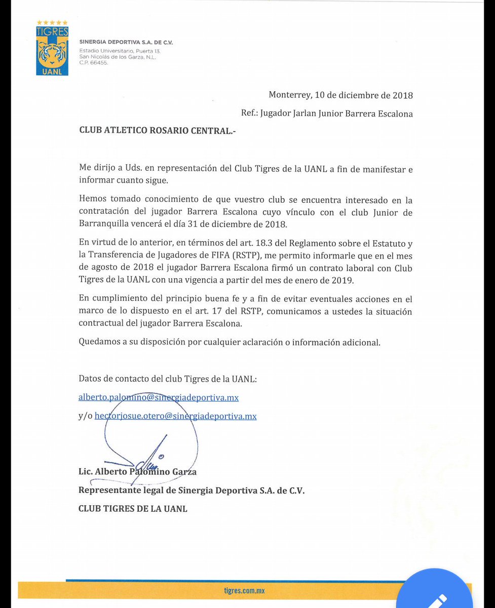 Es que el mediocampista colombiano de 23 años, quien hoy disputará la final de la Copa Sudamericana con los colores de Junior ante Atlético Paranaense, tenía todo acordado con Rosario Central para sumarse la próxima temporada, incluso con contrato firmado, pero al parecer ya había firmado otro vínculo con el Tigres de México.