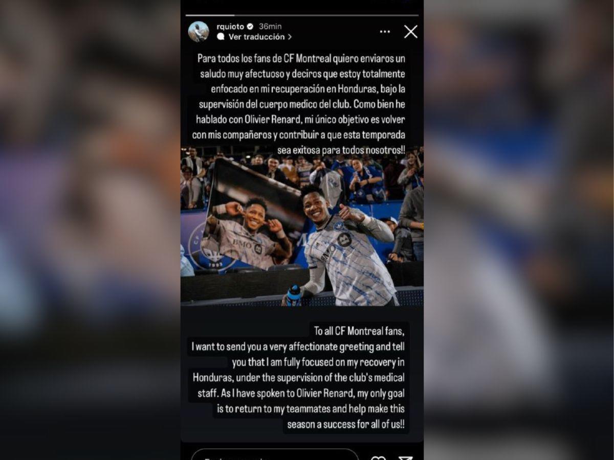 Sin embargo, el hondureño salió al paso de la polémica y reveló que la problemática se aclaró con el director deportivo del CF Montreal: “Para todos los fans del CF Montreal quiero enviaros un saludo muy afectuoso y deciros que estoy totalmente enfocado en mi recuperación en Honduras, bajo la supervisión del cuerpo médico del club. Como bien he hablado con Olivier Renard, mi único objetivo es volver con mis compañeros y contribuir a que esta temporada sea exitosa para todos nosotros”.