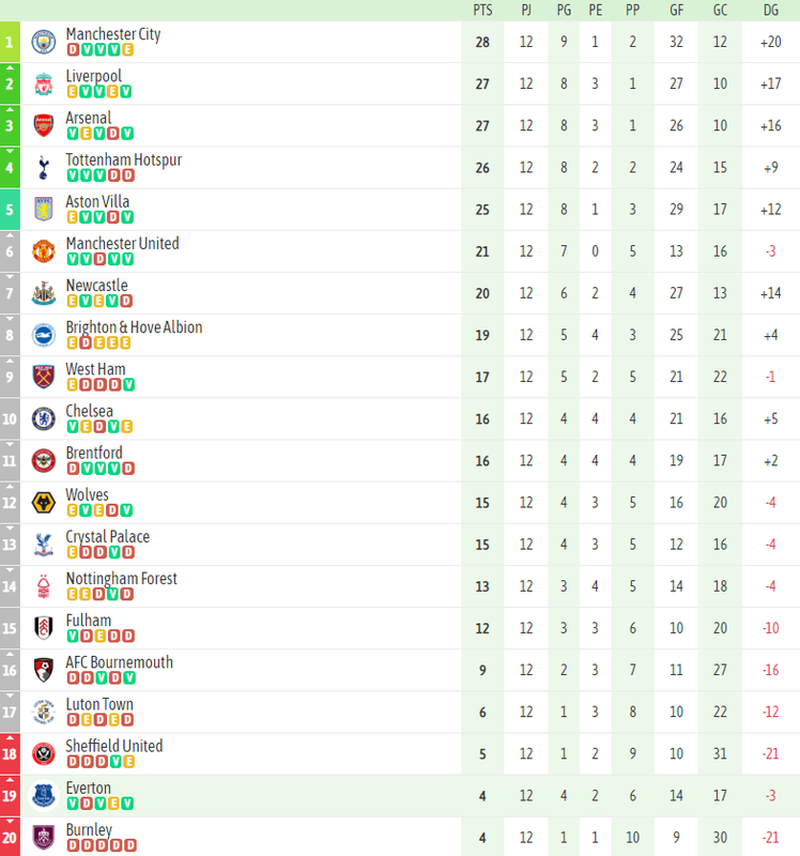 Everton quedó con 4 unidades y están en la casilla 19, tan solo por delante del Burnley. Figuran, por delante, el Sheffield United y el Luton Town.