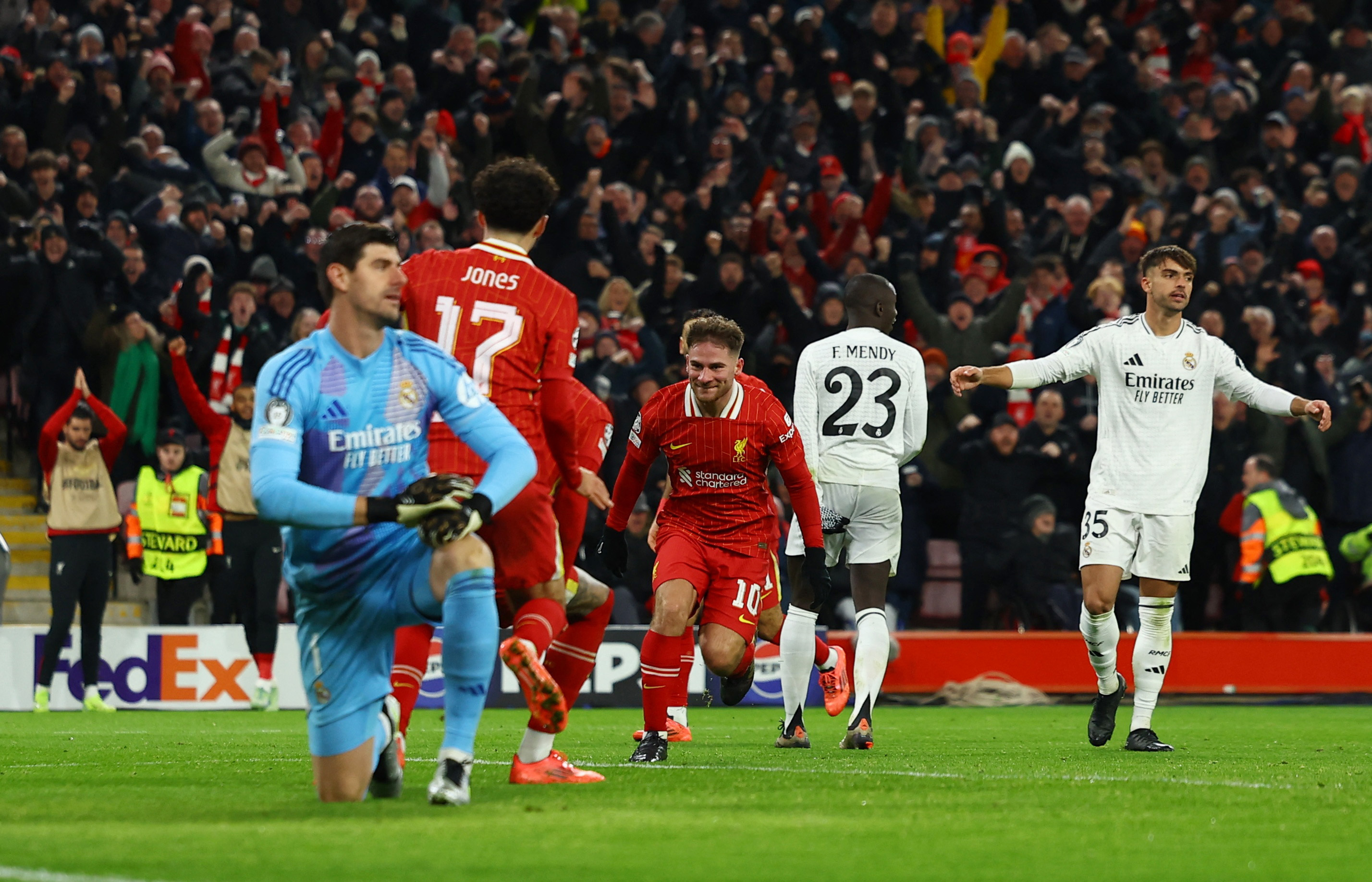 Los ‘Reds’ en la primera parte se quedaron con las mieles del gol en gran culpa por Thibaut Courtois y Raúl Asencio. El primer gran aviso de los locales llegó con una subida por el costado derecho de Salah, quien metió un centro raso, Courtois manoteó y el balón se vio en el joven zaguero que salvó sobre la línea de gol.
