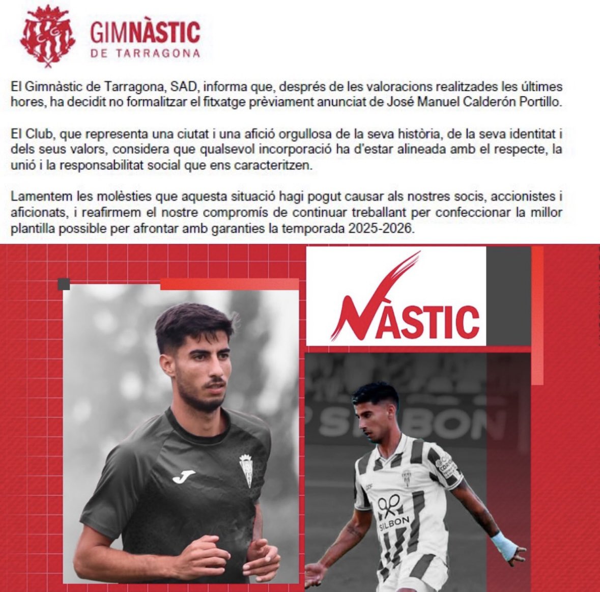 Ahora estas palabras le han pasado factura, ya que unas horas después de haber sido presentado como nuevo refuerzo del Gimnàstic de Tarragona lo dieron de baja.