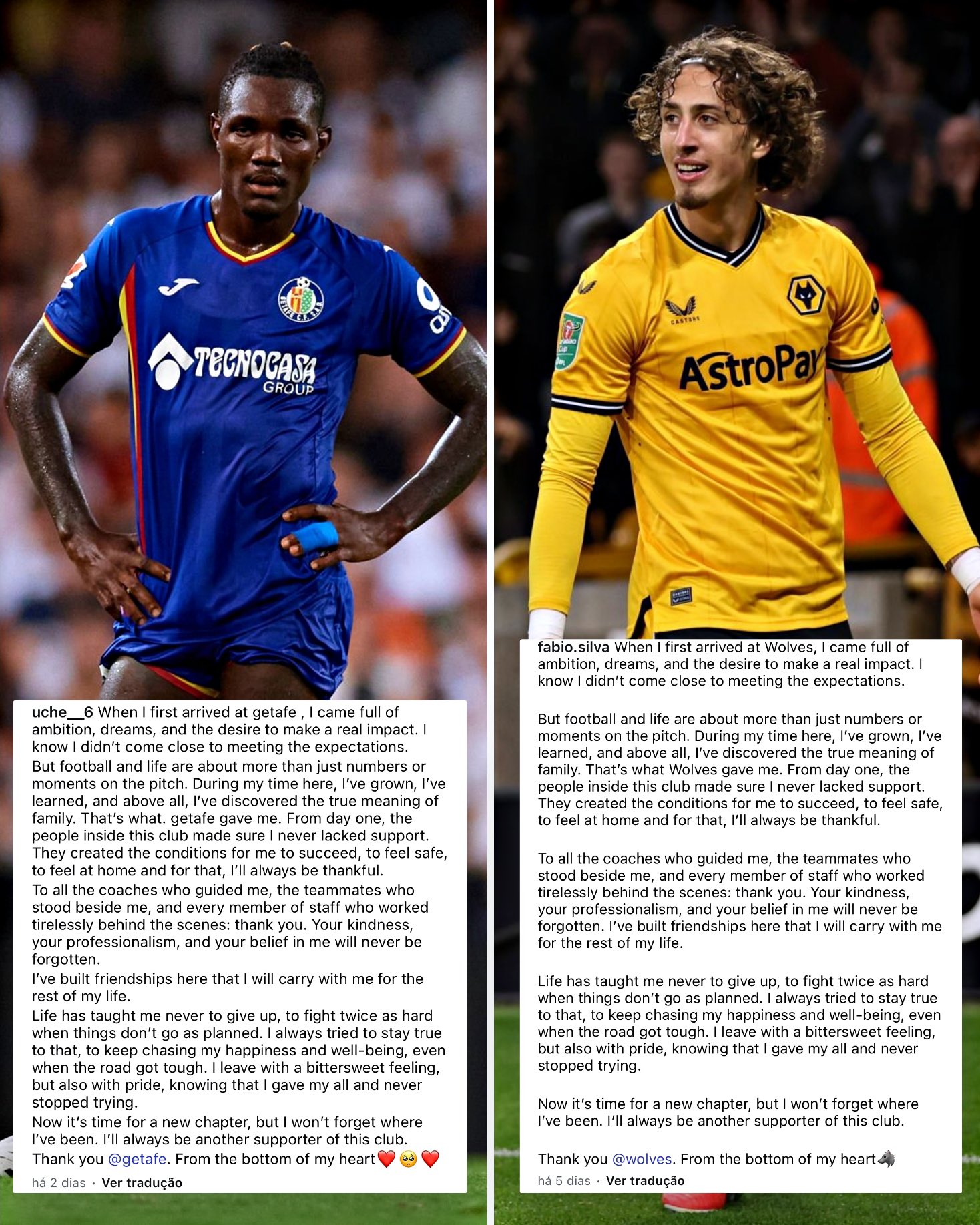 Uche, quien dejó el pasado lunes el Getafe para firmar con el Crystal Palace, y Fabio Silva, salió del Wolverhampton para ser nuevo refuerzo del Borussia Dortmund, tomaron la decisión de publicar una carta para despedirse de sus antiguos equipos y aficionados. No obstante, lo que llamó la atención fue que colgaron el mismo texto.