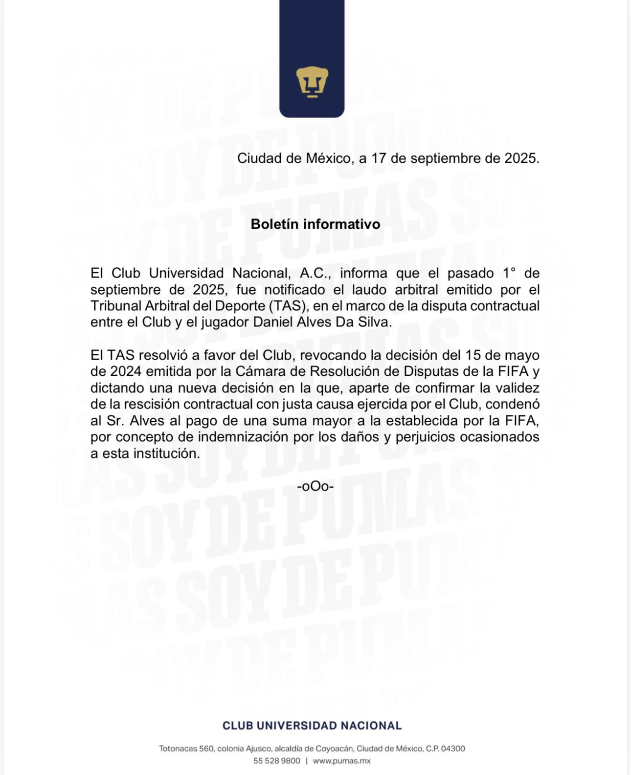 El Club Universidad Nacional, A.C., informa que el pasado 1° de septiembre de 2025, fue notificado el laudo arbitral emitido por el Tribunal Arbitral del Deporte (TAS), en el marco de la disputa contractual entre el Club y el jugador Daniel Alves Da Silva.