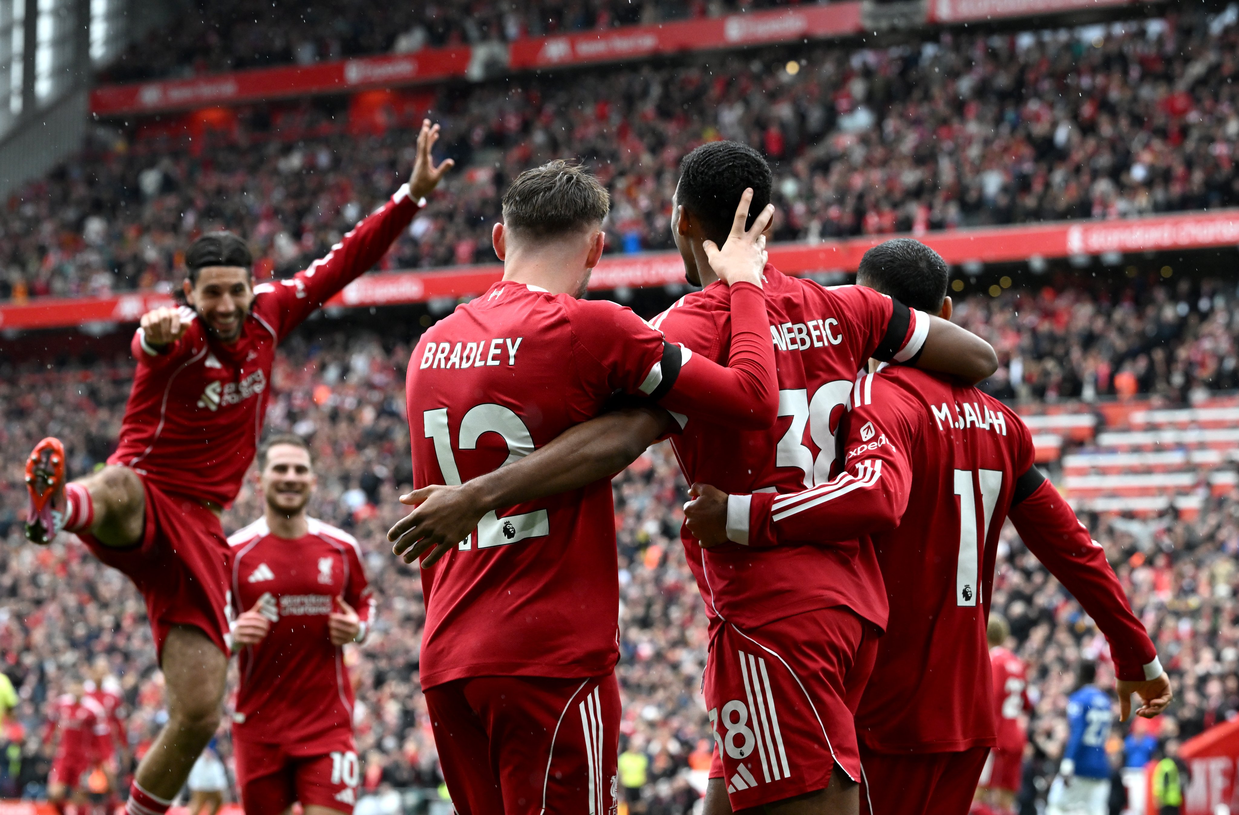 El primer tiempo fue un exhibición del Liverpool que impidió al Everton hacerse sentir en el terreno de juego de Anfield. La primera anotación llegó al minuto 10 con un gran remate del neerlandés Ryan Gravenberch tras la asistencia de Mohamed Salah.