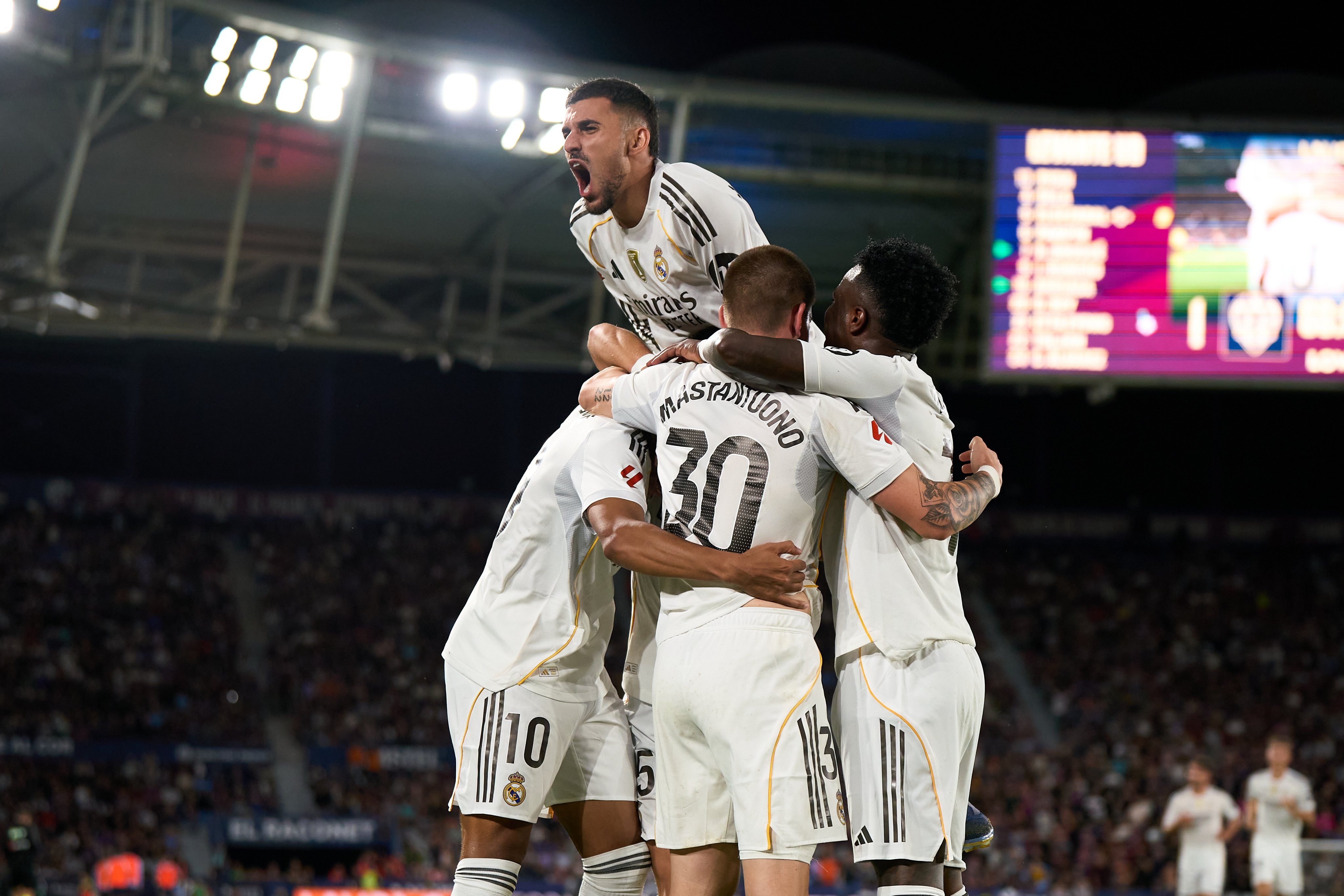 Los blancos eran superiores en todos los aspectos del juego, aunque no conseguían reflejarlo de tal forma en el marcador. Al 38’ Álvaro Carreras recuperó el balón y jugó con Vinicius, quien arrancó y observó por derecha a Mastantuono con todo el campo por delante. El argentino controló, encaró y amagó con la zurda para acomodarse de derecha y sacar su remate al ángulo del primer palo imposible para el arquero del Levante para el 0-2.