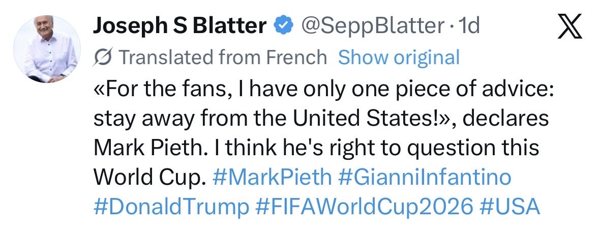 Ante esto, Blatter utilizó su cuenta de X para citar a Pieth y añadió: “Creo que Mark Pieth tiene razón al cuestionar esta Copa del Mundo”.