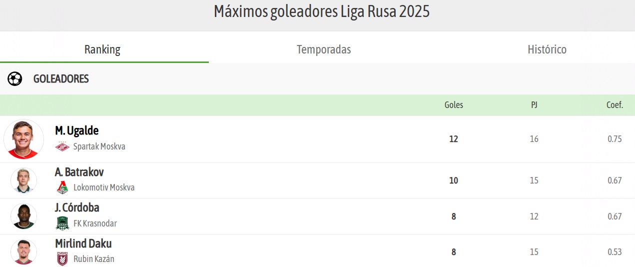 Manfred llegó a 12 anotaciones y encabeza la tabla de goleadores del balompié ruso. En el segundo lugar se ubica el ruso Aleksey Batrakov, quien juega en el Lokomotiv.