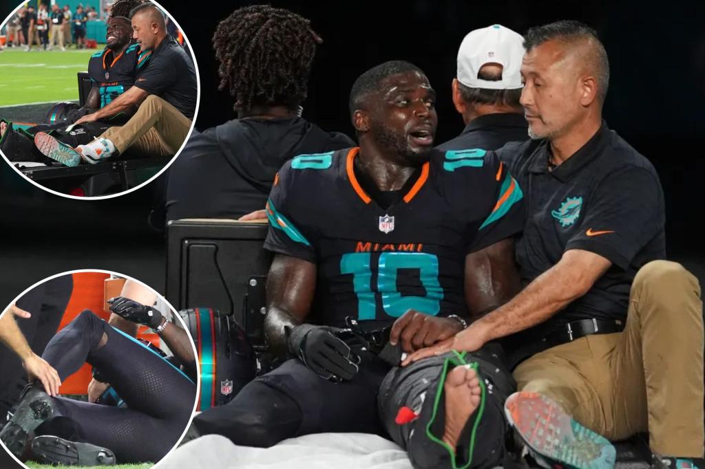 La estrella de la NFL, Tyreek Hill, sufrió una escalofriante lesión en su rodillas izquierda durante el juego de su equipo, los Miami Dolphoins, ante New York Jets en el Monday Night Football.