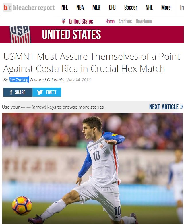 El reconocido sitio Bleacher Report, señala que "una segunda derrota consecutiva ante un oponente de poder en la CONCACAF pondría al equipo nacional en una situación desesperada con ocho partidos restantes... El partido del martes en San José, Costa Rica, no es necesariamente una obligación de ganar para los Yankees, pero es imperativo encontrar una manera de ganar un punto contra los ticos con el fin de crear un poco de impulso de cara al 2017".