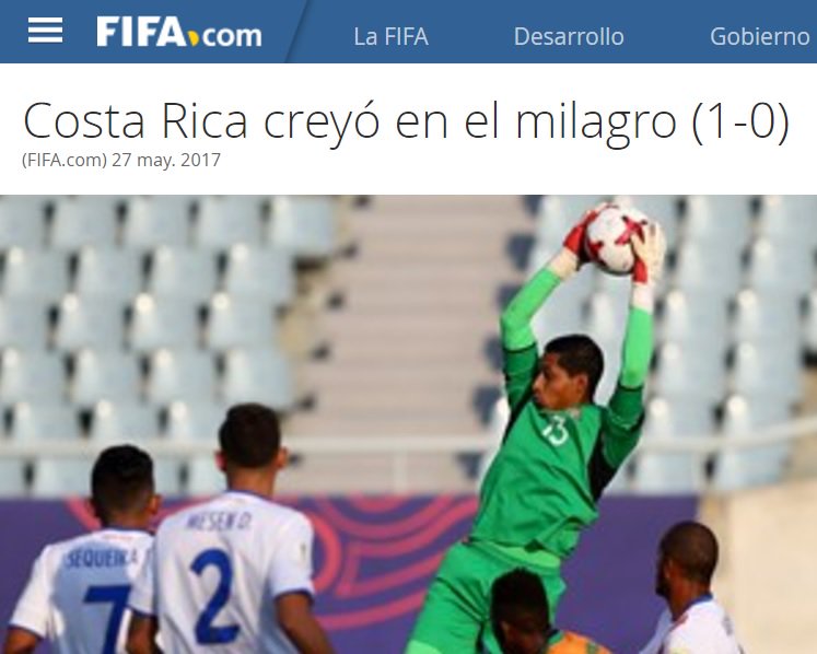 "Costa Rica creyó en el milagro (1-0)". De esta manera la FIFA en su sitio web encabeza la nota del partido entre la selección tica y Zambia. La victoria de la Sele le permitió al conjunto de Marcelo Hugo Herrera avanzar a los octavos de final.