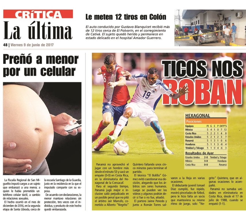 En el caso del Diario la Crítica tituló: "Ticos nos roban", haciendo referencia a un penal no sancionado al cierre tras una falta de Kendall Waston sobre Alberto Quintero.