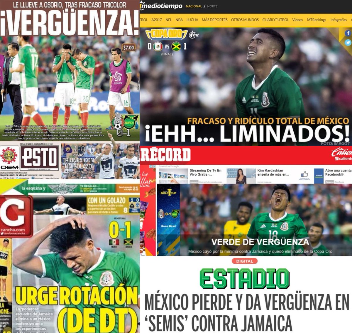 Un gran sector de la prensa deportiva mexicana pide la cabeza del técnico Juan Carlos Osorio tras la eliminación del conjunto azteca en la Copa Oro. La derrota 1-0 en semifinales contra Jamaica, sumado al fracaso en la Copa Confederaciones, tiene en un panorama complicado al estratega colombiano.