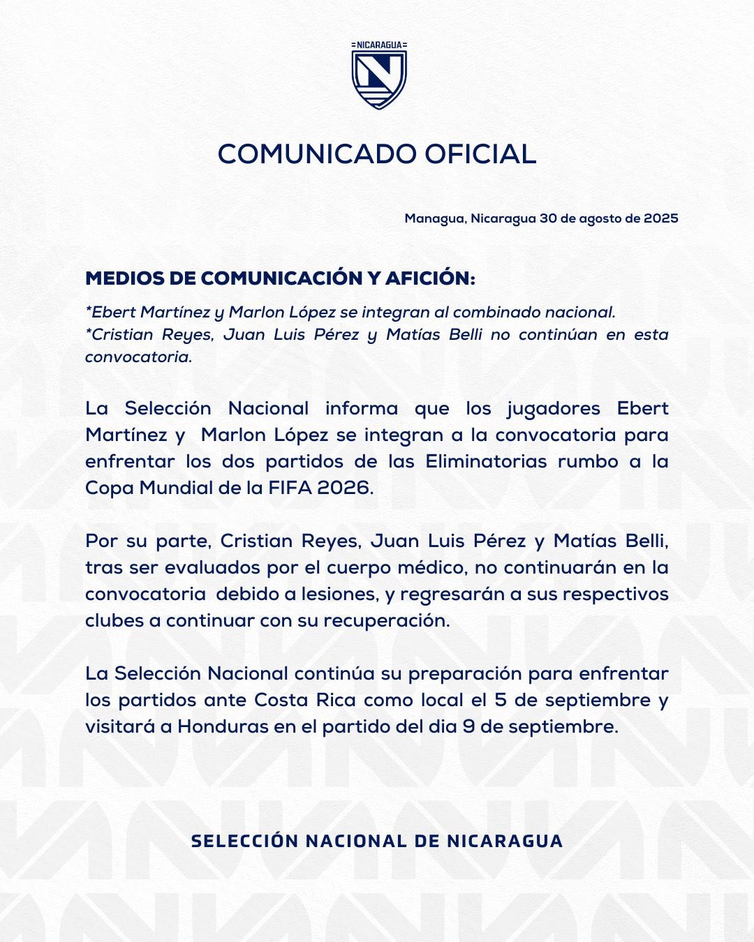 Ante esta situación, el técnico chileno Marco Antonio Figueroa convocó al defensor del Real Estelí, Ebert Martínez, y al volante del Managua, Marlon López.